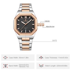 ◉ Japanese Quartz Movement: Crafted with a premium Japanese quartz movement, this watch ensures outstanding time accuracy. Whether for daily wear or special occasions, it provides reliable timing for the wearer. ◉ Square Case Design: The NF5048 features a sleek 26mm square case that perfectly blends classic and modern urban styles. The eco-friendly vacuum ion…
