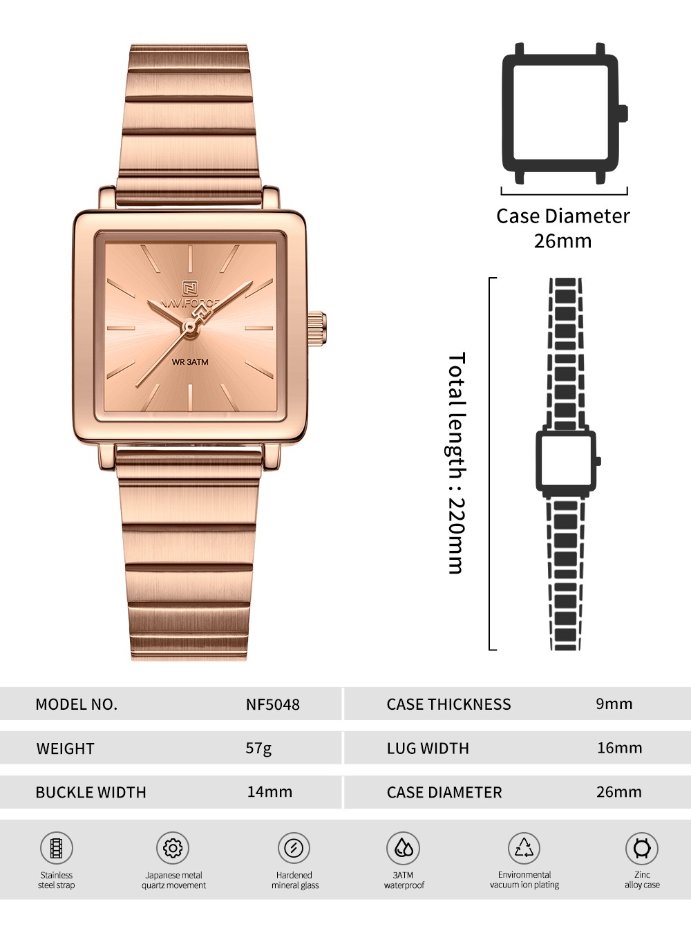 The NF5048 features a sleek 26mm square case that perfectly blends classic and modern urban styles. The eco-friendly vacuum ion plating process ensures a smooth and lustrous surface, showcasing exquisite craftsmanship.