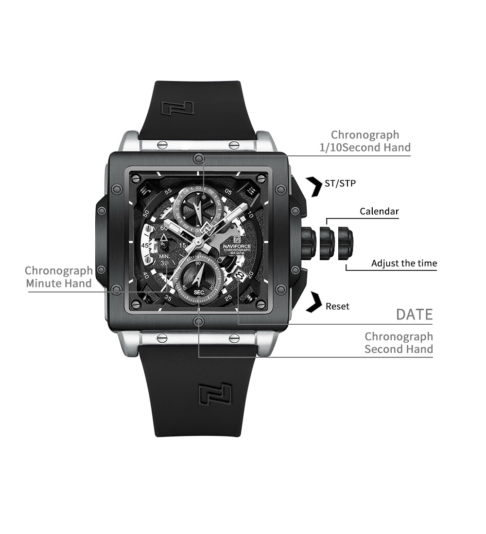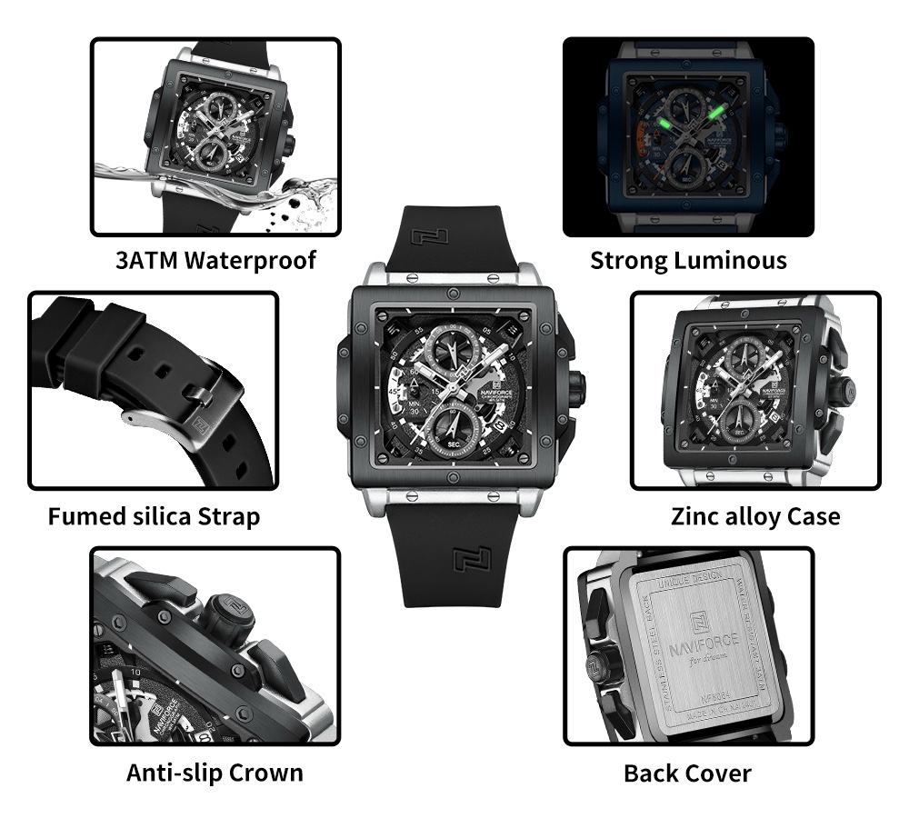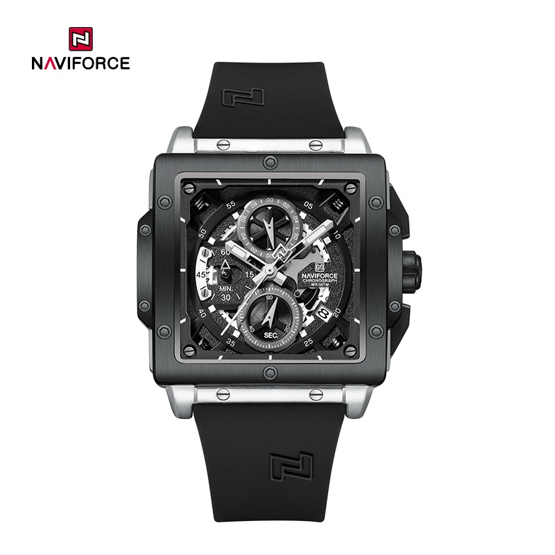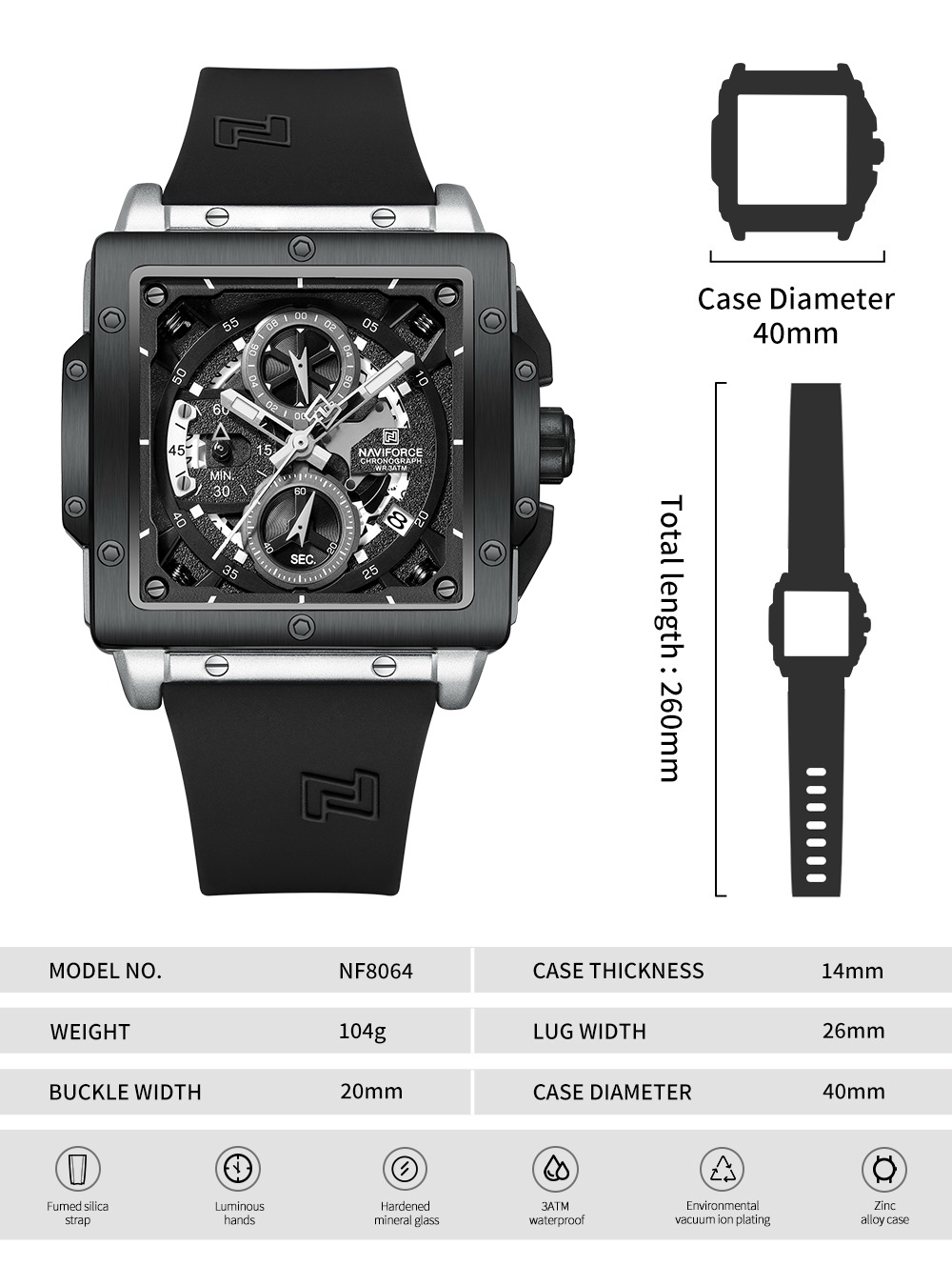 The Naviforce NF8064 Brand Fashion Men’s Wristwatch perfectly blends style and practicality. Its square dial, featuring a premium design, is enhanced by a chronograph function that adds sophistication to its sporty look. The stainless steel casing, combined with a robust silicone strap, guarantees durability and comfort on your wrist. The scratch-resistant dial window ensures the watch retains its flawless appearance over time.